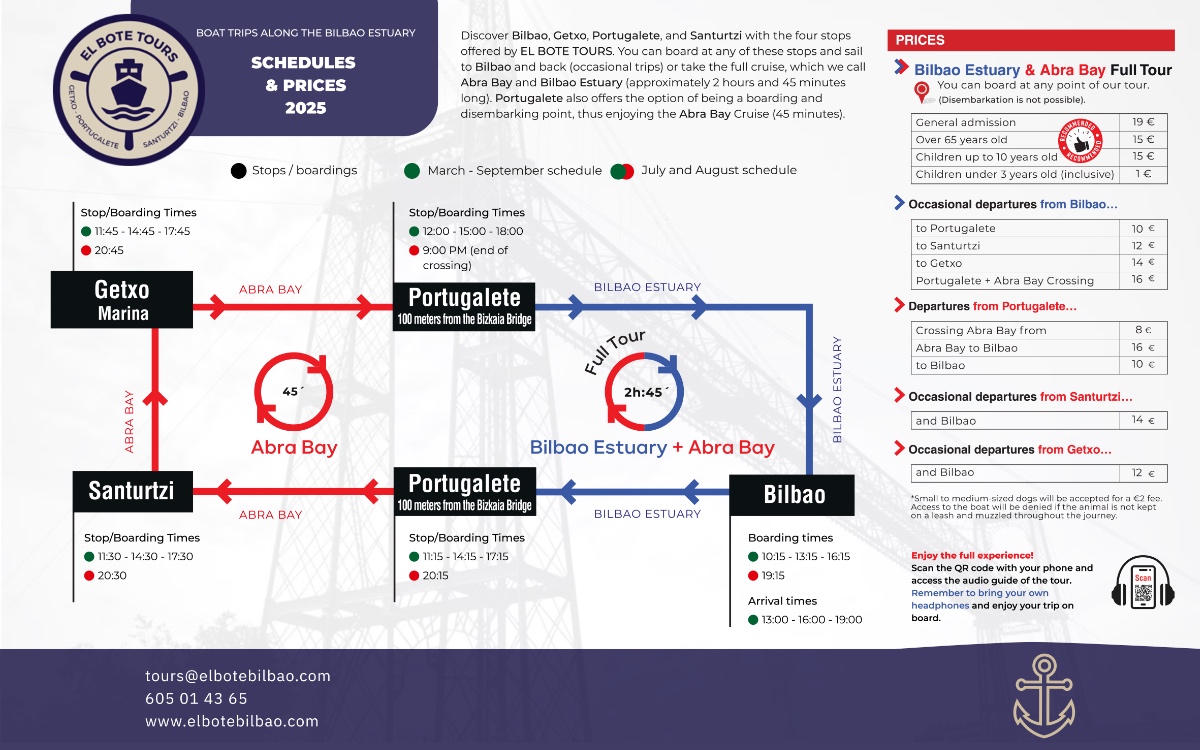 Come aboard with El Bote Tours and enjoy a unique visit to the city of Bilbao and the towns of Getxo, Portugalete and Santurtzi