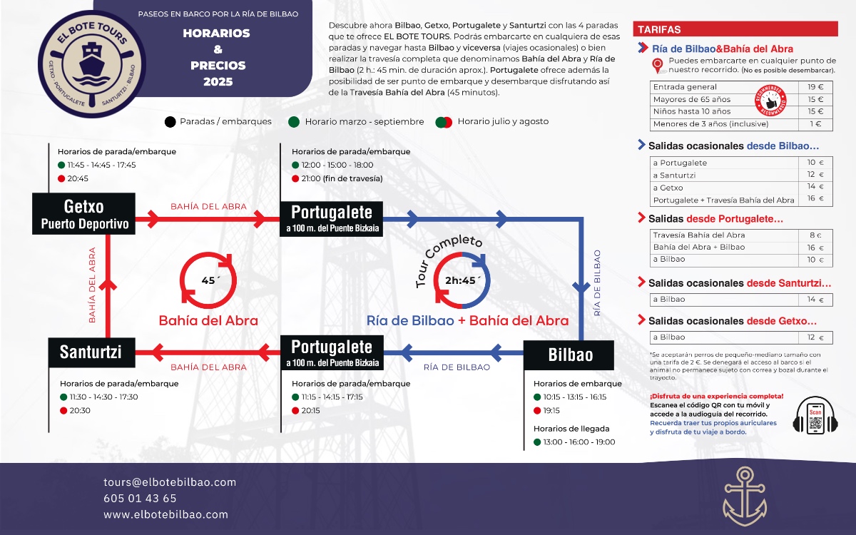 Contamos con un sistema de audio-guías (recuerda traer unos auriculares para tu móvil) en distintos idiomas (castellano, euskera, ingles, francés) que te ayudará a conocer el detalle de todo lo que vas a descubir en esta fascinante travesía. Podrás disfrutar además de antiguas imágenes en un monitor con diapositivas para que compares la trasformación que ha sufrido el entorno de la Ría de Bilbao en estos últimos años.